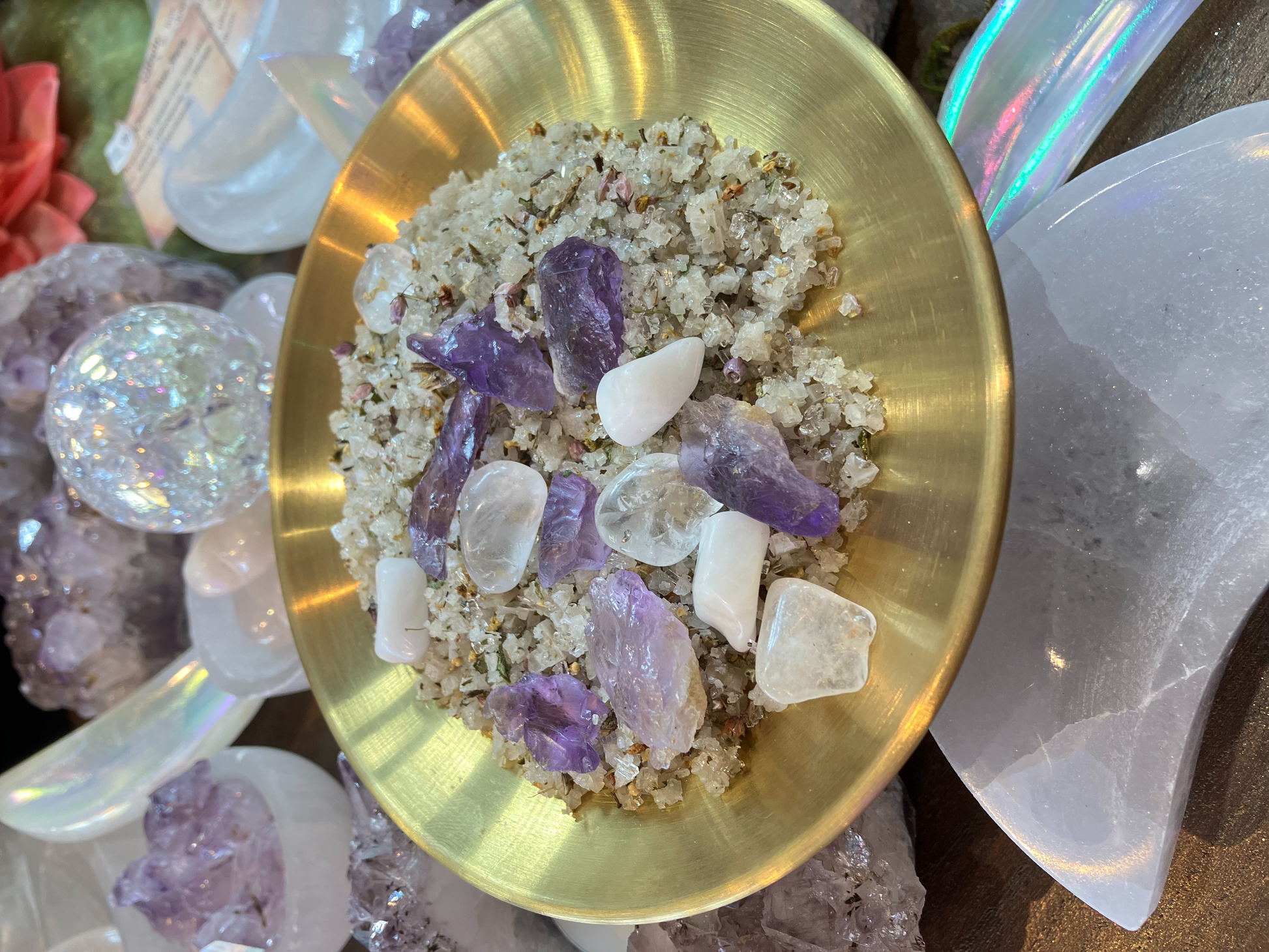 Nos sels magiques de douche ( rituel protection )éclosent dans notre antre de Saujon, façonnés à partir de sel local (port de l'Eguille, 17) et enrichis d'essences essentielles, de bois sacrés, de plantes mystiques et de pierres diverses.